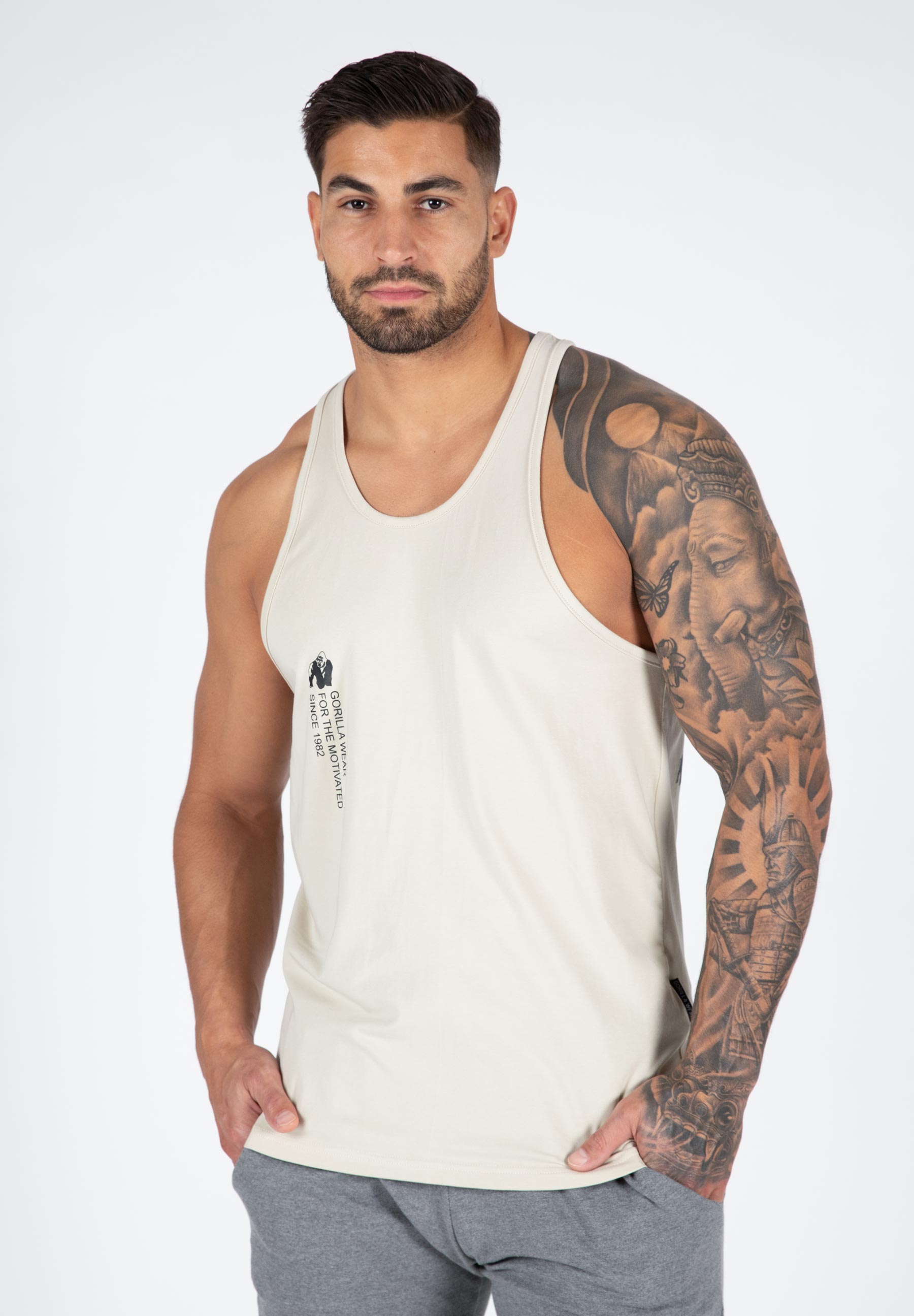 Show off the muscles you’ve worked so hard for with the Carrizo Tank Top. This top ensures that nothing limits you during workouts. It has a regular fit and feels light. It is made of a blend of high-quality cotton and elastane, making the tank top stretchy. Wearing a tank top allows for maximum freedom of movement. The Carrizo Tank Top features striking Gorilla Wear logos on the front and back. Available in two colors: Beige and Black. Show off your physique and let everyone know you are a member of #TEAMGORILLAWEAR!