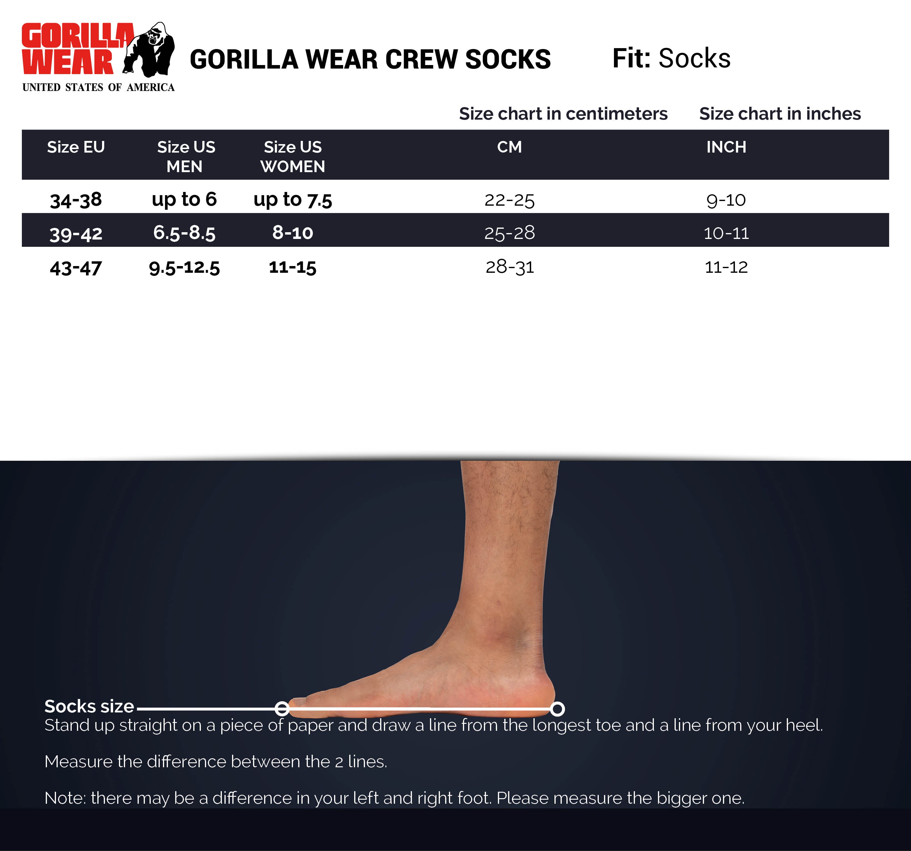 The Gorilla Wear Crew Socks are great to wear during workouts. They are made of a blend of cotton and elastane, making them stretchy and very comfortable to wear. The cuff fits perfectly around your lower leg. The ribbed band around your feet keeps the socks in place and prevents shifting in your shoes. The socks feature breathable holes so that sweat is wicked away to keep your feet dry. They are finished with Gorilla Wear logos to show that you are part of #TEAMGORILLAWEAR. Please note that this is only one pair of socks.