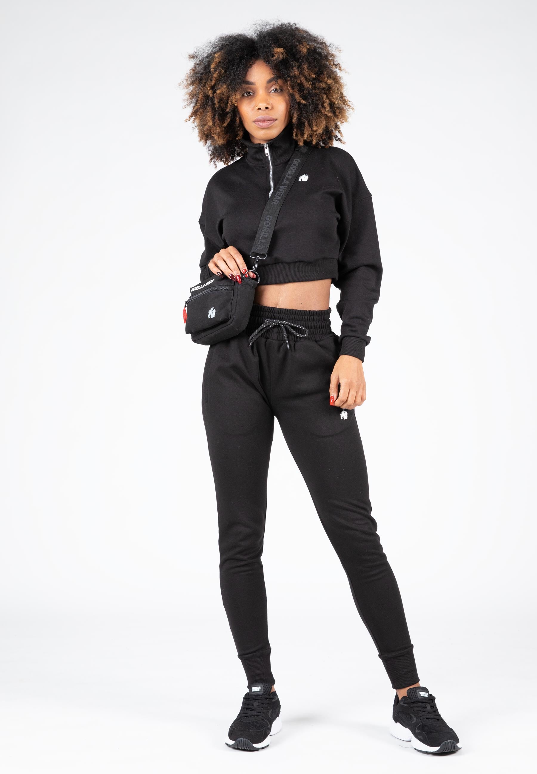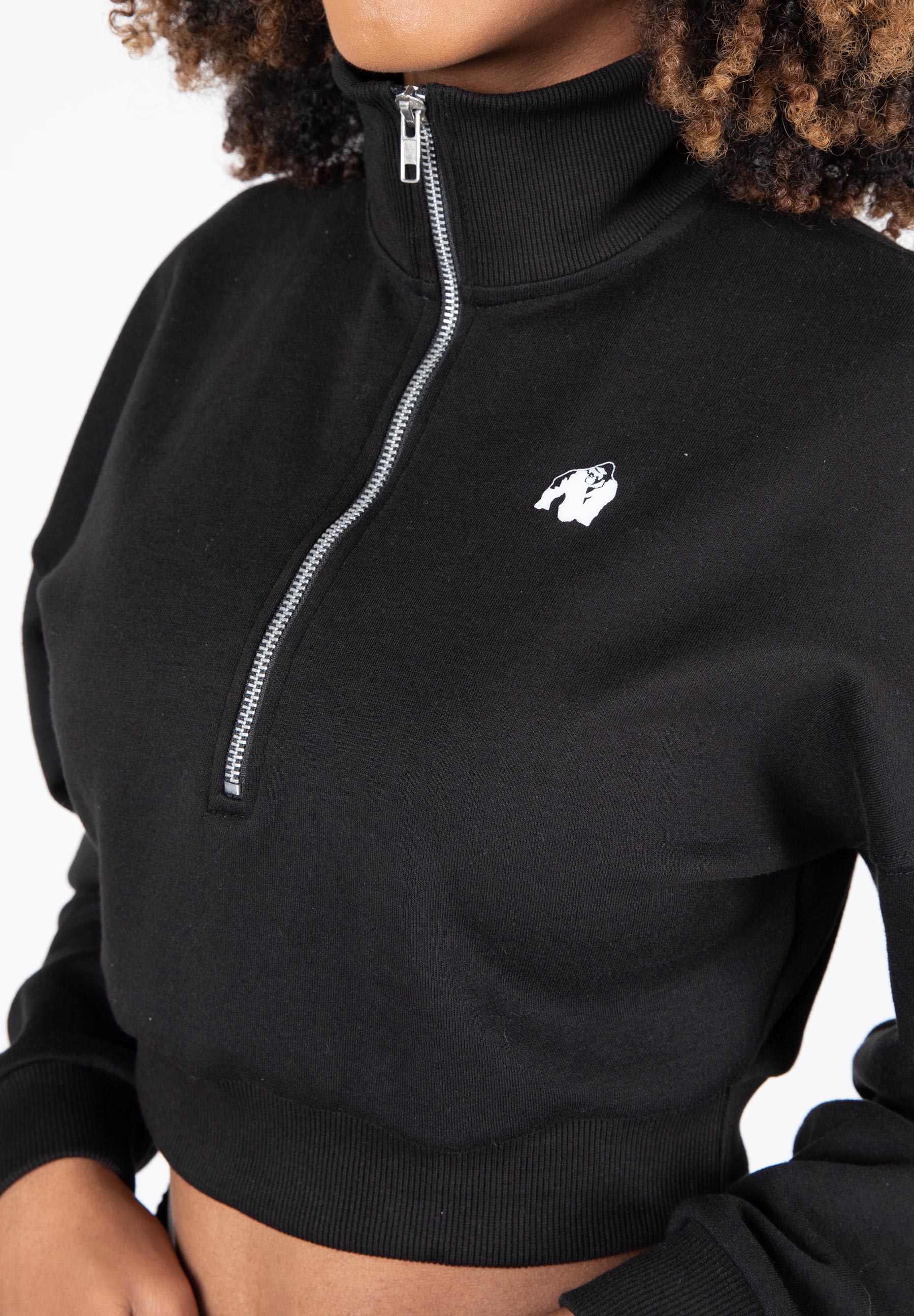 The name really says it all: Ocala Cropped Half-Zip Sweatshirt. This gorgeous sweatshirt has a loose fit and dropped shoulders which is very comfortable to wear. This top will keep you warm before, during, or after exercise, it’s up to you. The ribbed cuffs and collar fit snugly. It features a large half-zip and the recognizable Gorilla Wear logo. The Ocala Cropped Half-Zip Sweatshirt is available in Black and Gray.